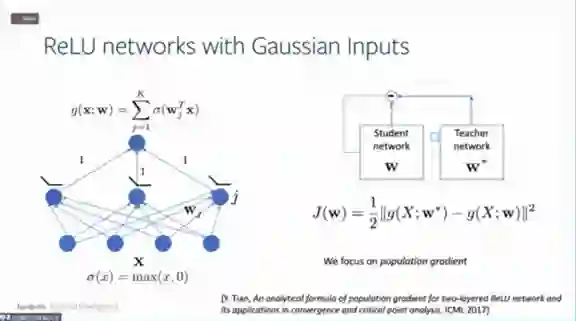 接下来讨论ReLU网络在学生-教师设置下的理论性质。设置是什么意思呢?举个例子,比如监督学习。在监督学习设置中,我们有将x标记为y的数据集,然后我们训练一个神经网络,输入x能得到y。