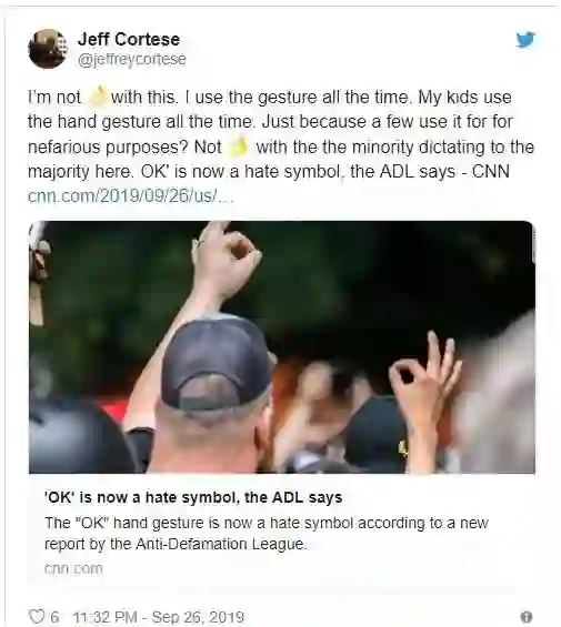 到了2019年,这个“OK”手势开始被广泛用作“白人至上”的表达形式。