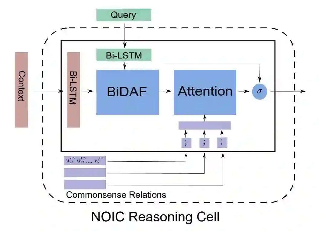 引入外部常识通过修改 Reasoning Layer 中的基本单元。具体做法是,每条路径的 embedding 表示为其每个节点的文本 embedding 的简单拼接,修改后的 Reasoning Cell 在经过 BiDAF 的 attention 结构后,再对该样本的所有外部常识三元组路径做 attention 计算,该 attention 计算再次更改文档和问题中每个词的表示。