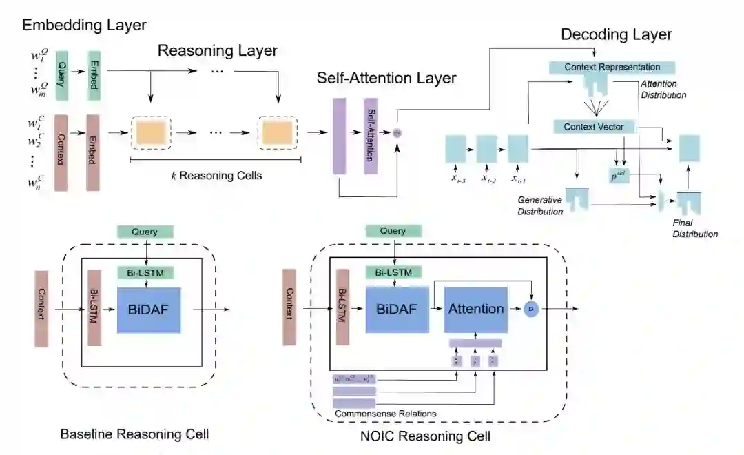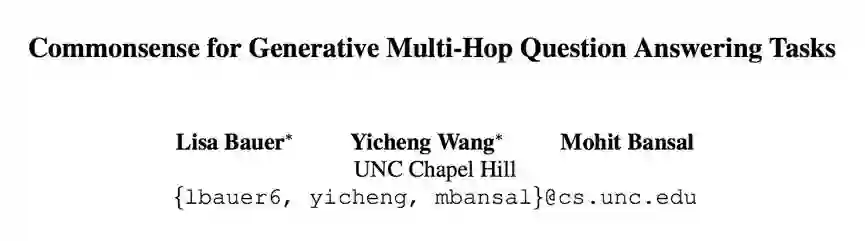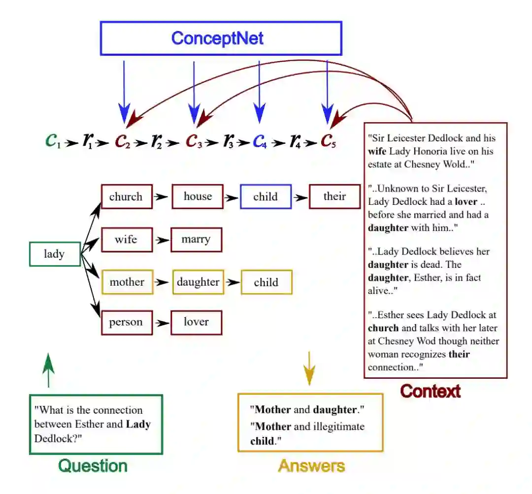 本文提出在 NarrativeQA 等需要多跳推理的文本进行生成式问题回答的模型。人工抽样数据集样本分析发现,许多样本答案的推理单凭文本包含的信息是无法完成推理并回答的,需要引入外部知识库中的常识信息。本文提出在常规的机器阅读模型中引入 ConceptNet 中的常识信息。