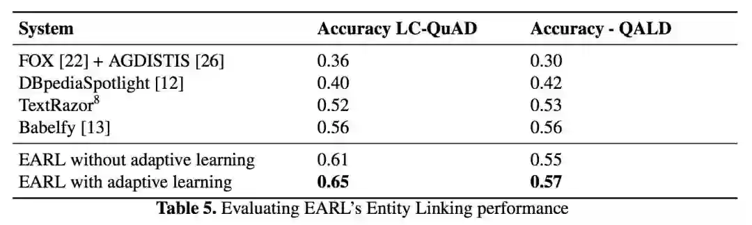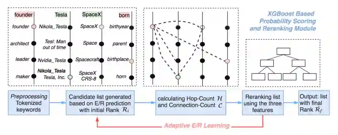 3. 额外的,本文提出了一种自适应实体/属性预测方法。如果消歧后某个实体/关系和它最终链接到的 URI 的置信度低于阈值,则可能预处理步骤的第二个子过程(实体/关系预测)有错误。在这种情况下,该工作会更改该关键词的实体/关系标签,重新执行候选生成和消歧步骤,从而获得整体精度的提升。