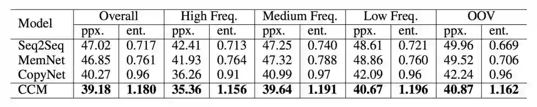 如下图 4 所示,为根据 perplexity 和 entity score 进行的性能比较,可见 CCM 的 perplexity 最低,且选取 entity 的数量最多。并且,在低频词时,选用的 entity 更多。这表示在训练时比较罕见的词(实体)会需要更多的背景知识来生成答复。