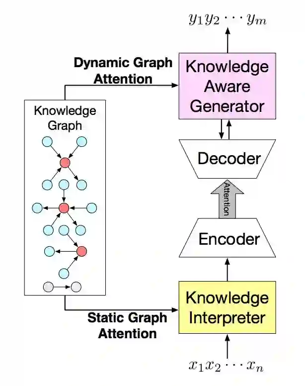 本文提出的方法,利用了大规模的常识性知识图谱。首先是理解用户请求,找到可能相关的知识图谱子图;再利用静态图注意力(static graph attention)机制,结合子图来理解用户请求;最后使用动态图注意力(dynamic graph attention)机制来读取子图,并产生合适的回复。