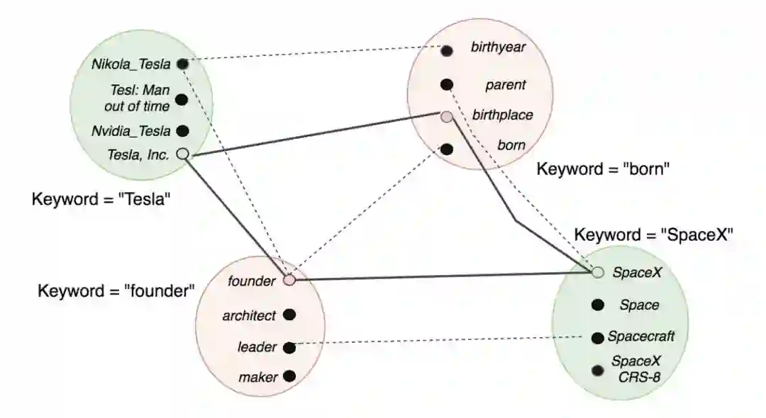 1. 利用 SENNA 系统从输入的自然语言问句中抽取出若干关键词短语。对于图中输入的问句,这里抽取到的关键词短语是<founder,Tesla, SpaceX, born>。