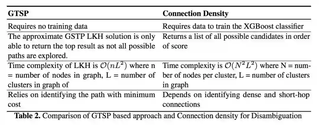 1. 基于广义旅行商问题(GTSP)的消歧方法。如下图所示,该方法将每个关键词的候选 URI 放入同一个簇。边的权重被设置为两个 URI 在知识库上的距离(hop 数),而联合消歧过程被建模为在该图上寻找一条遍历每个簇的边权总和最小的路(头尾结点可以不同)。