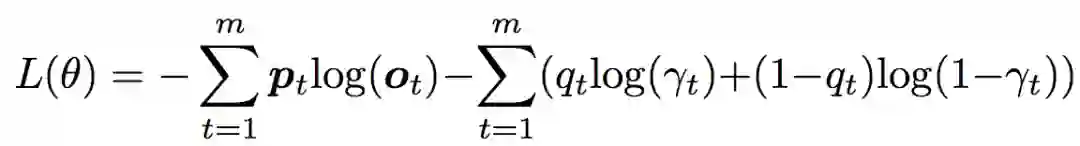 损失函数为预期输出与实际输出的交叉熵,除此之外,为了监控选择通用词还是实体的概率,又增加了一个交叉熵。公式如下: