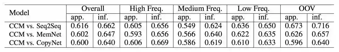 从图 5 中可见,CCM 对于三个基线系统来说,都有将近 60% 的回复是更优的。并且,在 OOV 的数据集上,CCM 比 seq2seq 高出很多,这是由于 CCM 对于这些低频词或未登录词,可以用知识图谱去补全,而 seq2seq 没有这样的知识来源。