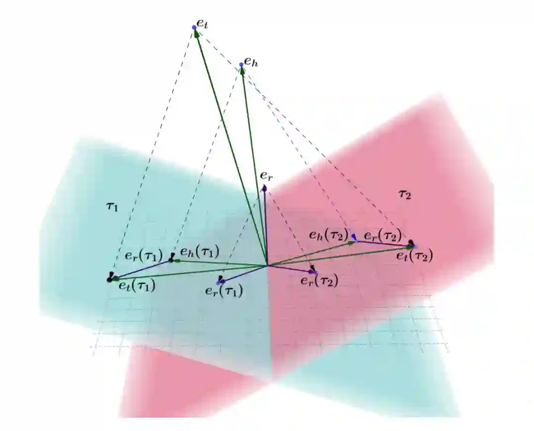 所以在本文的模型中,希望实体能够随不同的时间点有着不同的表示。为了达到这一目的,文中将时间表示成超平面(hyperplane),模型示意图如下: