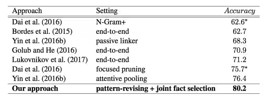 实验评价指标为准确率,仅当问题对应的事实与模型得到的实体和谓词两者都匹配时,才算准确匹配。