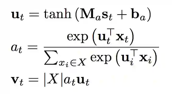 其中,ut 是由 GRU 中 st 产生的隐藏表示,attention 权值 at 则是由一个 softmax 函数计算得到,反映的是单词 xt 对于序列 X 的重要性,而后依据此权重与隐藏表示可以得到 self-attention 的输出 vt,|X|(输入序列的长度)用于防止 vt 失去原有的规模。
