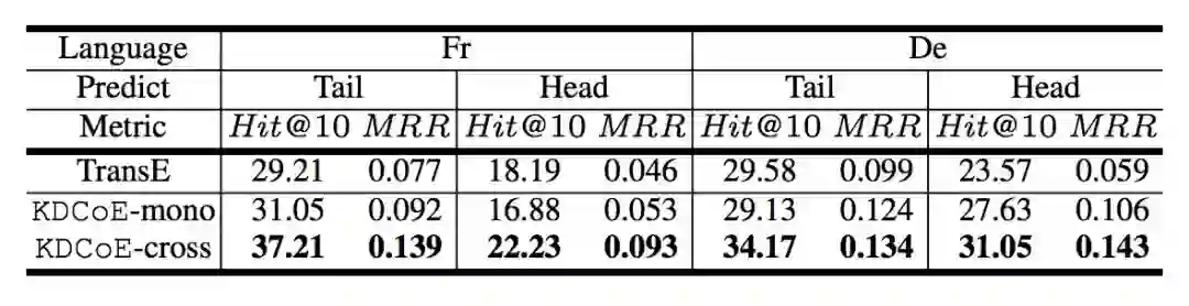 根据 KDCoE-mono 的表现,可以推断,该模型成功继承了 TranE 保持结构化知识中实体和关系的稳定性。而 KDCoE-corss 则反映引入跨语言信息确实对知识补全的效果起到了明显提升。