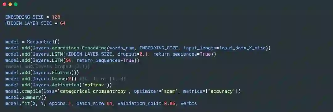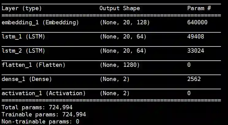 本项目的代码采用了 Keras 实现,底层框架是 Google 开源的 TensorFlow。整个模型包含 6 层,核心层包括 Embedding 输入层、中间层(LSTM)、输出层(Softmax)。