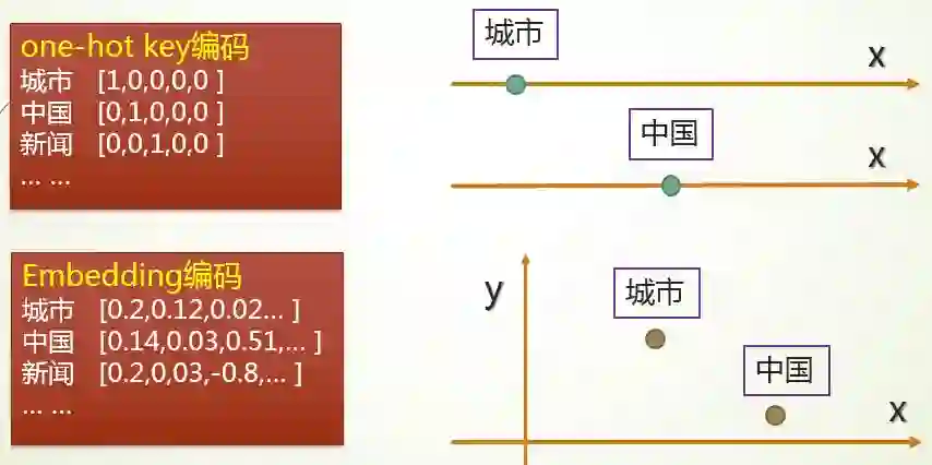 作为对比,One-Hot key 可以粗略地被理解为用一条线表示 1 个词,线上只有一个位置是 1,其它点都是 0,而词向量则是用多个维度表示 1 个词。