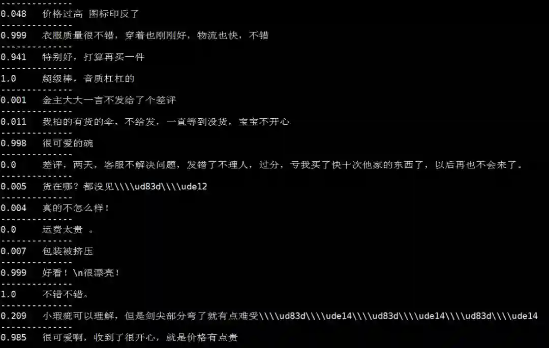 测试集情感分类的部分结果(数值代表该评论是正面情感的概率):