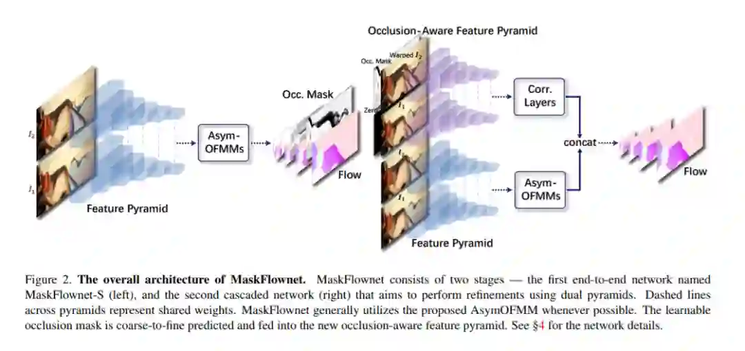 特征warping 是光流估计的核心技术之一。然而,warping 过程中被遮挡区域引起的模糊性是一个尚未解决的主要问题。本文提出了一种非对称遮挡感知的特征匹配模块,该模块可以学习一种粗糙遮挡掩模,该掩模在特征warping 后立即过滤无用(遮挡)区域,而不需要任何显式监督。该模块可以很容易地集成到端到端网络架构中,在引入微不足道的计算成本的同时,还可以获得性能提升。学习后的遮挡掩模可以进一步反馈到具有双特征金字塔的后续网络级联中,从而达到最先进的性能。在提交时,我们的方法MaskFlownet超过了MPI Sintel、KITTI 2012和2015基准上所有已发布的光流方法。