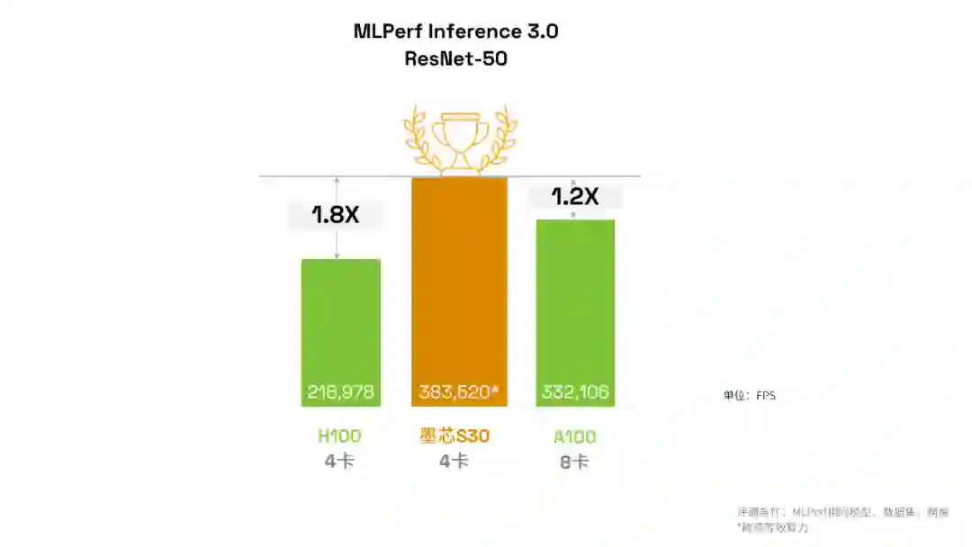 单机 4 卡第一,算力超 8 张 A100:墨芯 30 计算卡获得 ResNet-50 模型 “整机 4 卡” 冠军,算力 383,520 FPS,达英伟达 H100 的 4 卡成绩的 1.8 倍,并且超过英伟达 A100 的 8 卡成绩。