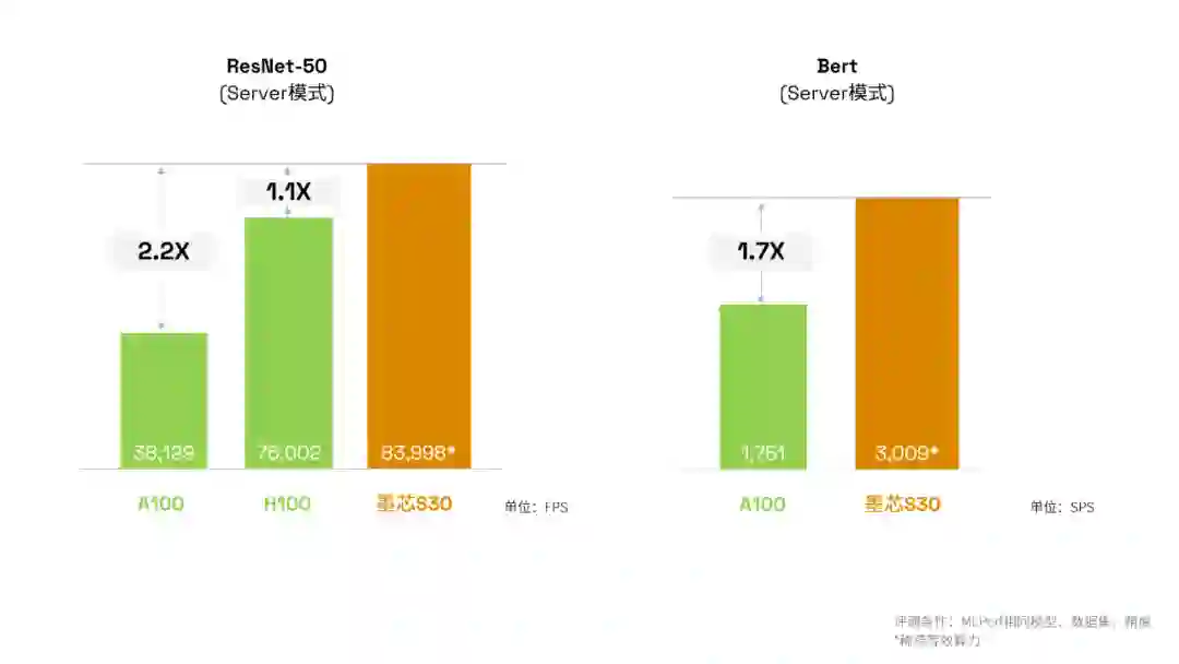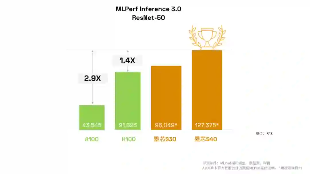 刷新算力纪录:墨芯 S40 计算卡首次亮相 MLPerf,在数据中心的图像任务主流模型 ResNet-50 上夺得冠军,算力达 127,375 FPS。S40 计算卡性能达英伟达 H100、A100 的 1.4 倍和 2.9 倍。