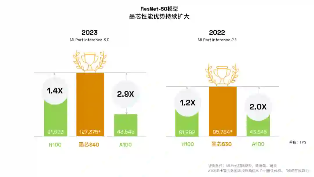 二度问鼎,优势持续扩大:这是墨芯第二次在 ResNet-50 模型上夺冠。墨芯 S40 计算卡比上届冠军 S30 计算卡的算力增幅达 33%,体现出持续的产品性能提升能力。与上一次 MLPerf 相比,墨芯产品相较 H100 和 A100 的算力优势分别扩大了 20% 和 90%。
