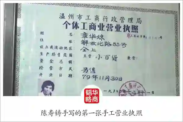 1980年底,第一张手工营业执照被发到了在温州街头卖纽扣的章华妹手里。证号为“10101号”,经营范围为“小百货”,开业日期标注为“1979年11月30日”。