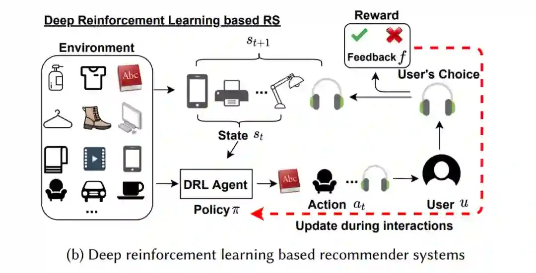 近年来,推荐技术有了长足的发展,从传统的协同过滤、基于内容的推荐、矩阵分解等推荐技术[62],到基于深度学习的推荐技术。特别是深度学习在解决复杂任务和处理复杂数据方面具有很强的优势,因为深度学习能够捕捉非线性的用户-项目关系,能够处理图像、文本等各种类型的数据源。因此,它在推荐系统中得到了越来越多的应用。由于分布的变化,基于深度学习的推荐系统在捕获兴趣动态方面存在局限性[17,115],即训练阶段基于现有的数据集,这可能不能反映真实的用户喜好,而用户的喜好变化很快。而深度强化学习(deep reinforcement learning, DRL)的目标是将深度学习和强化学习的力量结合起来,训练出一种能够从环境提供的交互轨迹中学习的agent。由于DRL中的agent可以主动从用户的实时反馈中学习,从而推断出用户的动态偏好,因此DRL特别适合于从交互中学习,如人-机器人协作; 它还推动了一系列互动应用的显著进步,从视频游戏、Alpha Go到自动驾驶[3]。鉴于DRL对推荐系统的重要性和最近的进展,我们旨在在本次综述中及时总结和评论基于DRL的推荐系统。