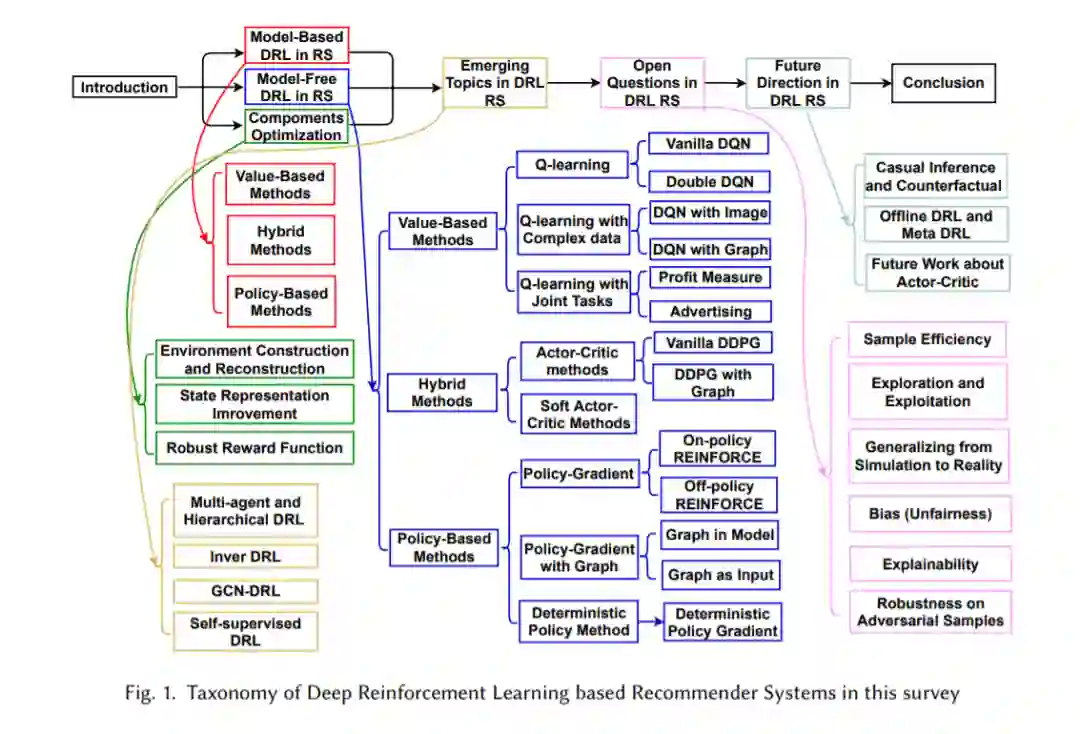本综述的其余部分组织如下: 第2节概述了推荐系统、DRL及其集成。第3节提供了一个分类和分类机制的文献综述。第4节回顾了出现的话题,第5节指出了未解决的问题。最后,第6节为这一领域的进一步发展提供了一些有前景的未来方向。