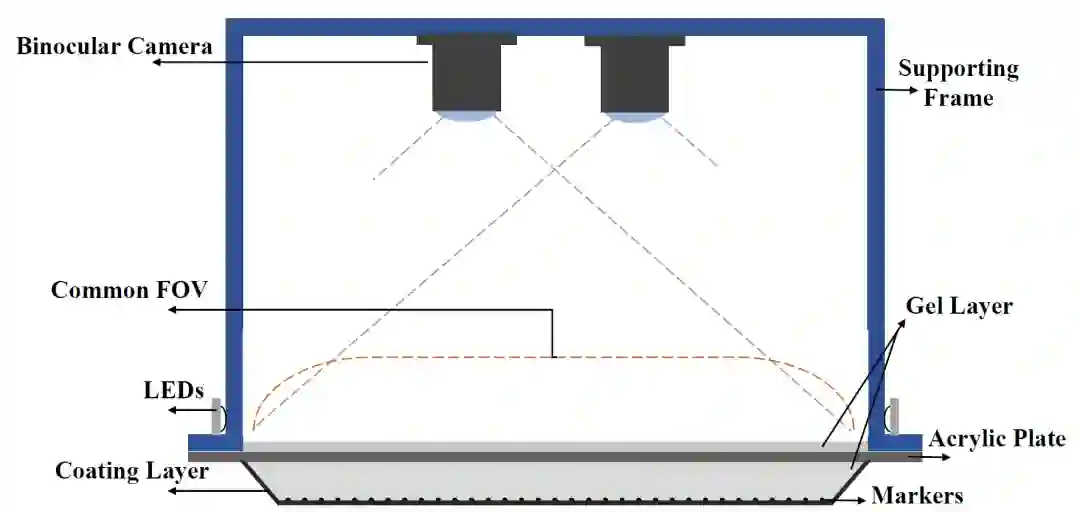 传统的触觉传感器多为贴片式阵列传感器,通常将触摸信号转化为不同电信号,进而从电信号分布中间接恢复出其他不同的接触模式信息,如接触力、接触形状。这类触觉传感器具有集成简易、采样率高等优势,但因为制作工艺复杂也存在着空间分辨率不高、成本高昂及容易损坏等问题,严重阻碍了其大规模应用。近年来,以GelSight传感器为代表的视触觉传感技术在触觉精密测量、机器人抓取与灵巧操作等领域受到广泛关注,它们将触觉信息转化为胶体层的形变进而使用视觉算法获取多模式触觉信息。此类传感器突破了大多数技术路线无法获取稠密接触几何形状的难题,但因为光度立体算法的使用,对光源结构要求较高,且光照分布一致性的要求阻碍了其在多曲率仿生指尖结构中的部署,在具体应用场景中依然受限。