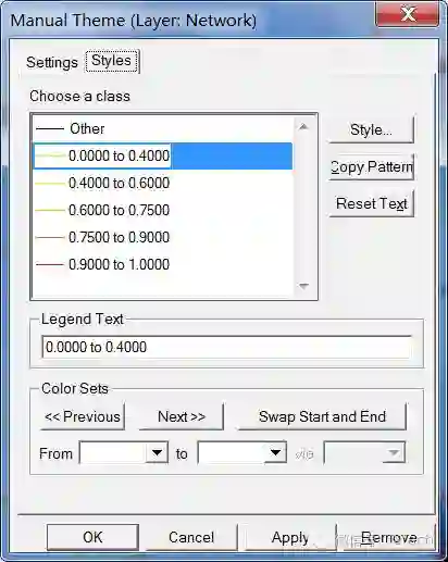 在 Create Themes 选项打勾,在 Max V/C 编辑框输入最大V/C 值,type an interval value 在Interval Size 编辑框输入一个分级值,在下拉菜单选择起始、结束和中间颜色。