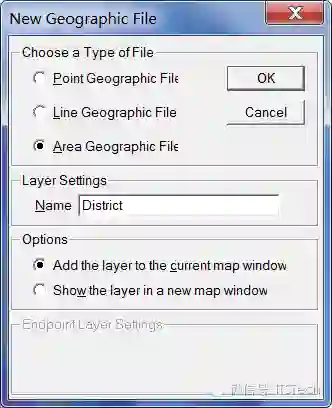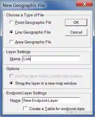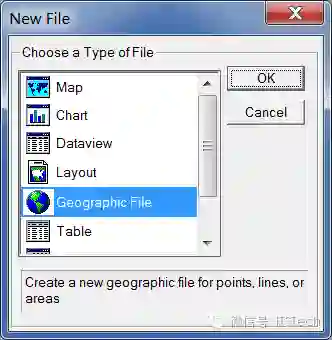 点选菜单File/New,打开New File窗口,选择Geographic File点击OK按钮;弹出New Geographic File对话框,选择Line Geographic File, 点击OK按钮。