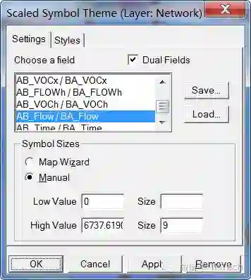 选择菜单Map>Scaled Symbol Theme或单击 按钮,进行流量图设置。设置可按Save按钮存储为显示设置文件,供以后调用。