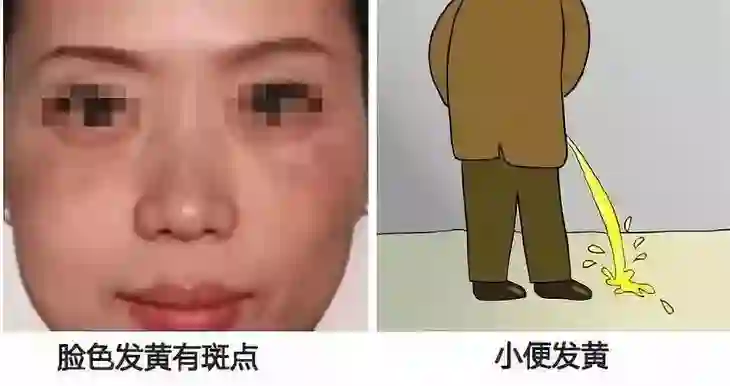 肝功能水平低,身体毒素堆积,2个地方发黄,一是脸色发黄有色斑,二是小便是暗黄色。
