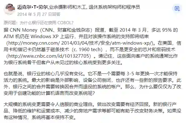 还有人表示,几十年过去,对整个系统进行完全替换和重写的成本太高。既然旧系统仍旧能用,还不如继续维护。