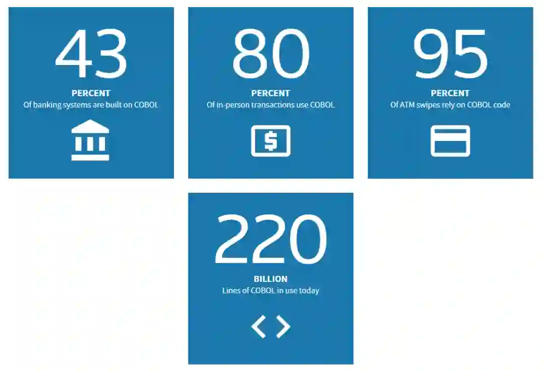 显示,今天仍有 2200 亿行 COBOL 代码正在使用, 43% 的银行系统和 95% 的