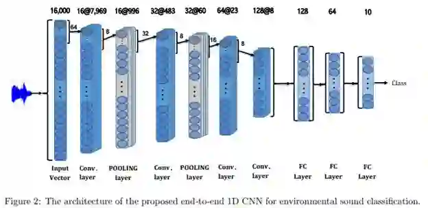 加拿大的一组研究人员最近提出了一个端到端的一维CNN环境声音分类模型。根据音频信号的长度,该模型由3-5个卷积层组成。与许多传统方法实现二维表示的传统模型不同,这一模型是直接从音频波形中学习分类器。