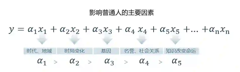你们现在是18岁,现在开始,拿到博士学位要10年左右,再成为正教授还需要10年左右,要成为学术领袖估计还得至少10年。在今后这30多年的人生中,你们要经历很多的事件,一个人的成就是各种国际、国内、社会、家庭、配偶、朋友、个人在30-50年内发生的随机事件和因素叠加的结果。简单表述为一个统计求和。 比如,我们从这里去天安门,一路上要受到交通灯、行人、车辆、交通管制、修路、事故等不可预知的随机事件的叠加影响。最后,行程的时间y就是这些随机变量的加权求和(是系数)。 根据概率论的“中心极限定律”(Central Limit Theorem),当n足够大,那么累积的结果必然服从一个正态分布,俗称“钟形曲线”。大部分人(95%)位于正负两个方差之内,这是社会的大多数 (the crowd),是各行各业的主力军;少数(2%)的人在属于百里挑一的“优秀”人才(Excellent);只有少数人会达到之上,成为万里挑一、甚至百万里面挑一的“杰出”人才,英文中的Outstanding就是指杰出,他们是统计学中的“离群点”(Outlier),Outstanding就是要Standing out of the crowd。 今天的你们,是从全国挑选出来的最优秀的一群大学新生,站在一个很好的人生起点。未来如果你们随波逐流,就会回到普通人群中去;如果立志成为杰出人物,还需继续奋斗,要特立独行,才能成就这个目标。 其次,我们来看看成才的基本要素。