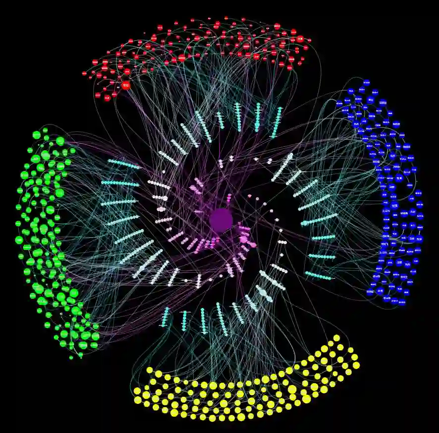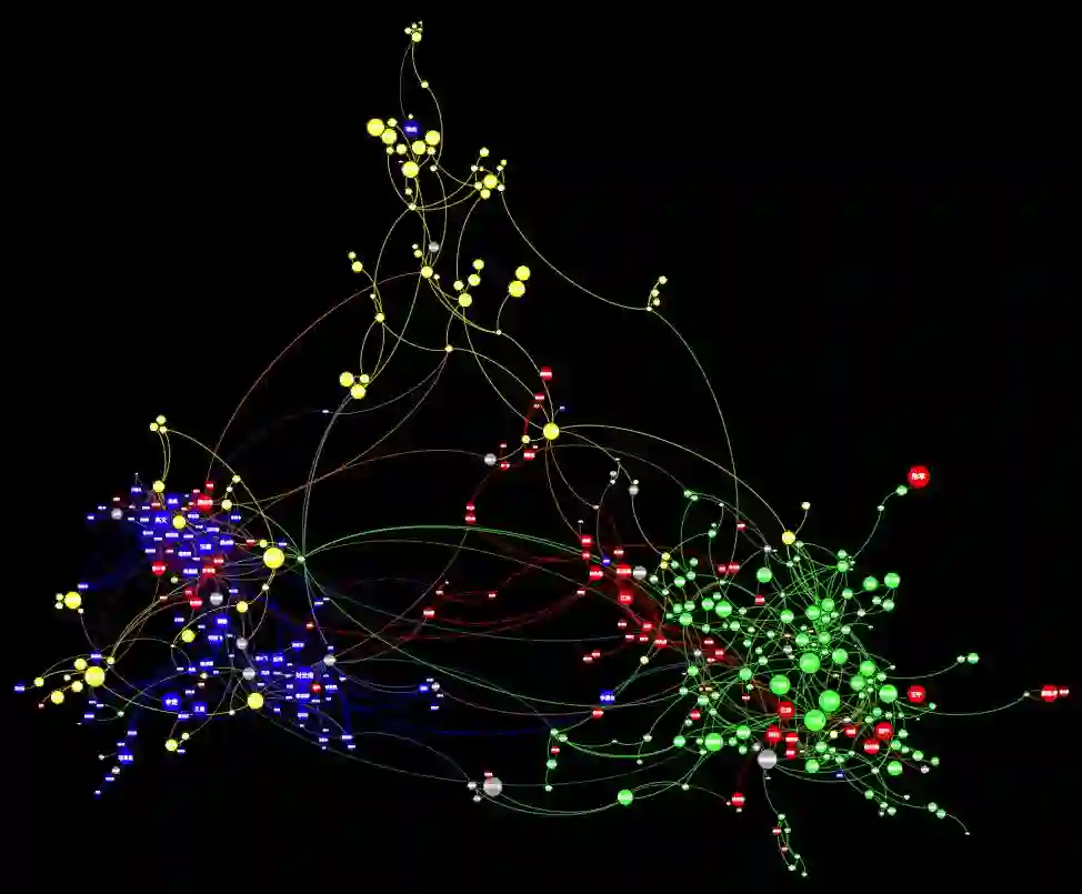 此外,通过对于处内关键词的词频的分析,我们也可以看到一些现象,例如图中左下角的绿色的四处部分,其早年间的关键词通常都是包括光学等基础理论,而近年来,则更加偏向于诸如量子等更加趋向于应用和前沿的词语,这也说明了这一学科理论的逐渐完善,和新领域的不断开拓。而类似的现象也发生在了一处的关键词之上,诸如微波、电磁场等关键词,其与外围年份对应的连边中,粉色系边的数量明显要多于青色系的数量,也即也体现出了明显的偏向于早年的特点。