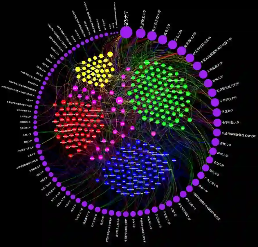 图6在对各人才计划获评的项目名称进行自然语言处理与标签提取的基础上呈现信息科学部各处的关键词之间和其与学术机构之间的联系。图中各个学术机构用紫色的节点表示,红色的节点代表信息科学部一处的关键词,黄色代表二处,绿色代表三处,蓝色则代表四处,中间粉色的节点表示该关键词出现在了不止一个处的项目中,属于跨学科的领域。所有的学校根据获评项目的数量进行顺时针排列。从图中可观察到,清华大学获评数最多,第二梯队中,北京理工大学、北京邮电大学、北京航空航天大学、华中科技大学等与其他C9高校实力相当。对于单个机构进行观察,可以发现不同学校之间研究侧重点上的差异。例如与北京邮电大学相连接的边几乎全部都是红色,意味着该机构在科研方面重点着力于信息科学部的一处;而吉林大学与苏州大学连接的边则以蓝色占据绝对的主导地位,说明这两所学校的研究领域主要分布在四处。