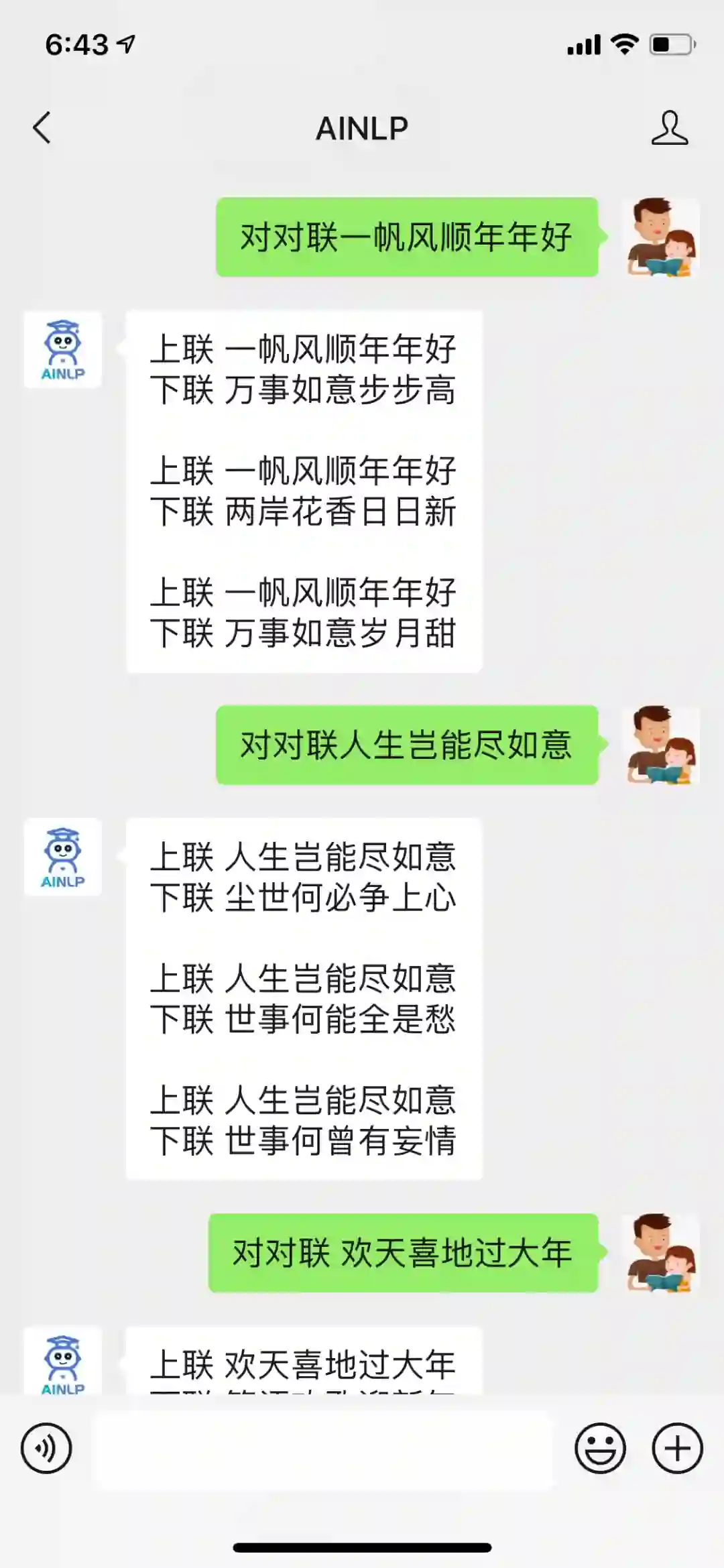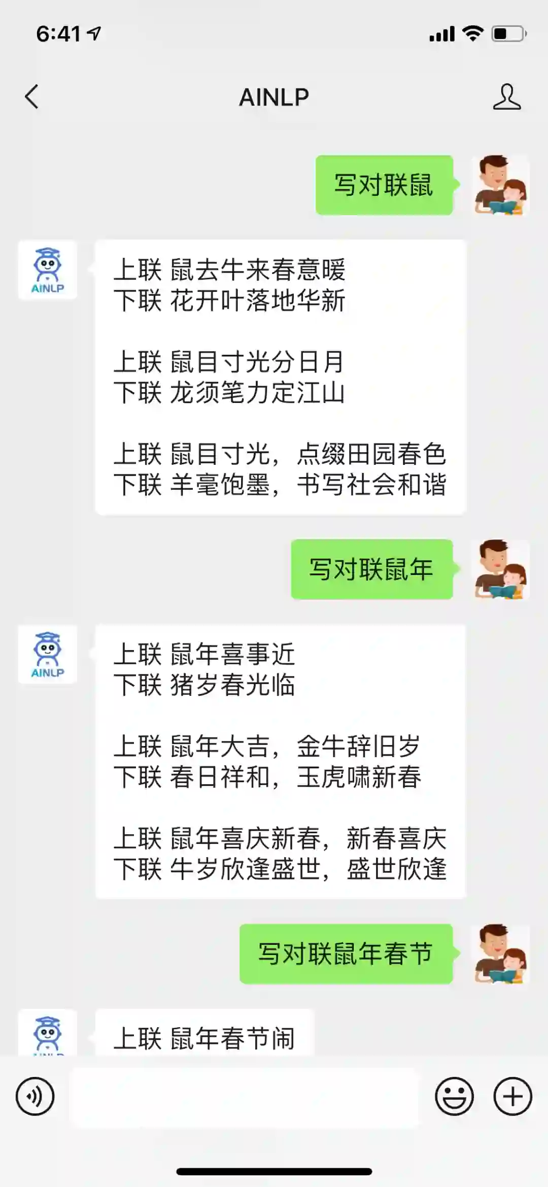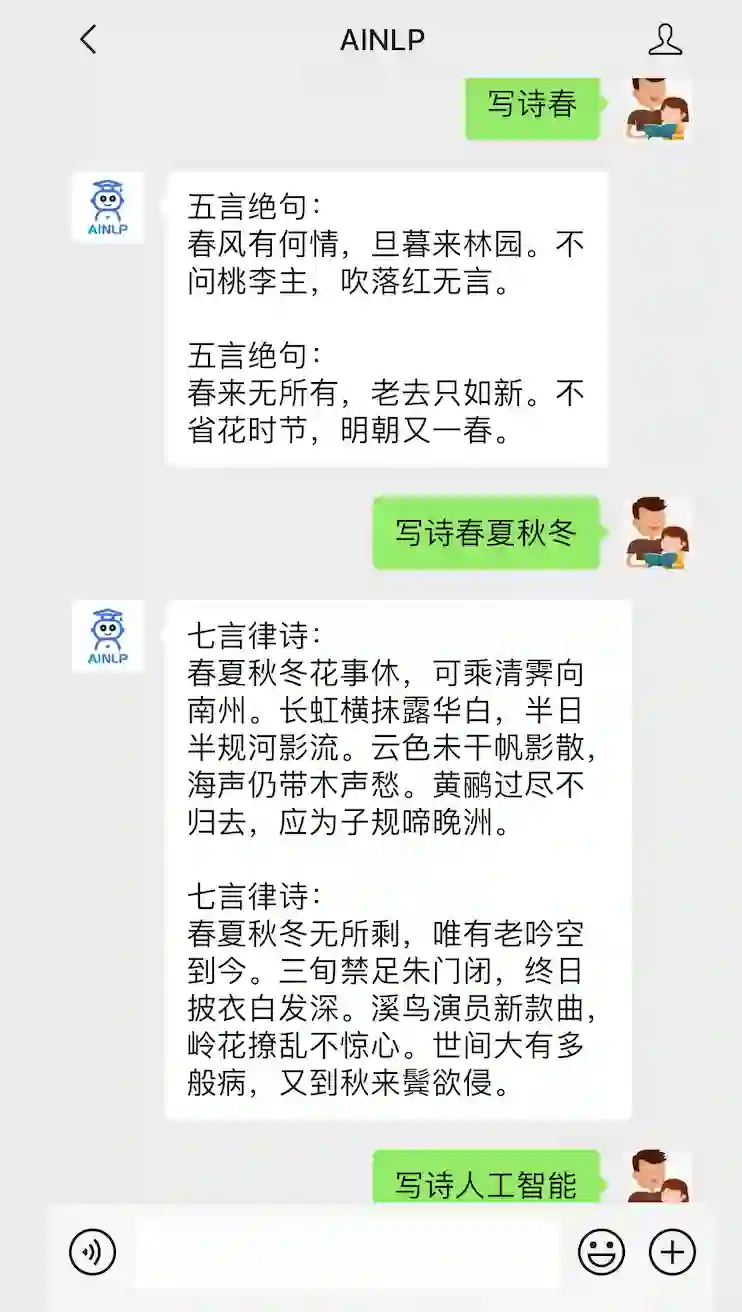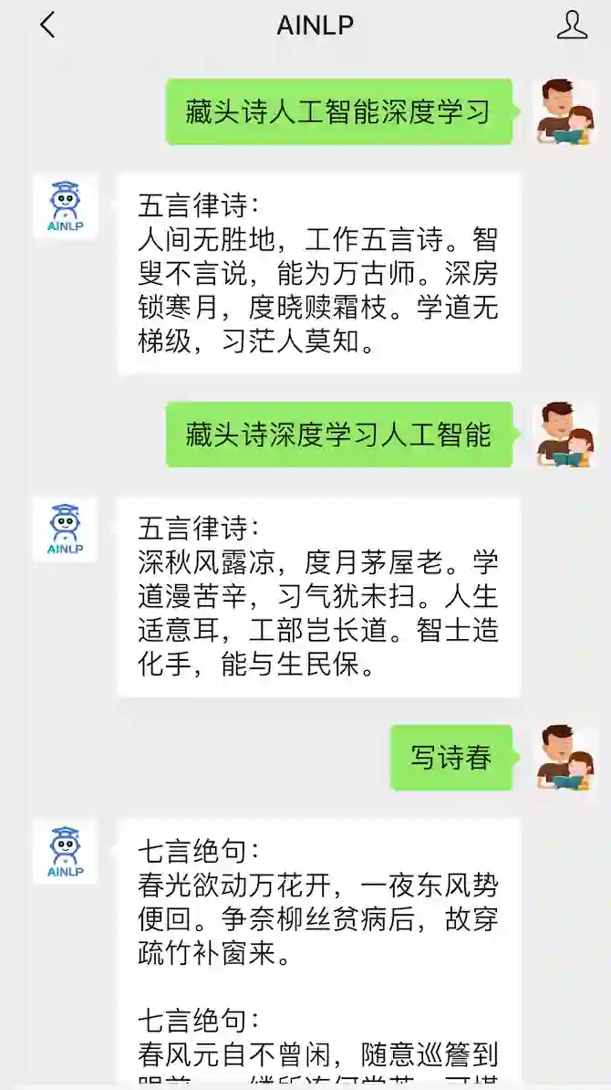 AINLP不仅仅可以玩分析查询,还可以玩自然语言生成,例如对对联,写对联,自动作诗等,包括五言绝句、七言绝句、五言律诗、七言律诗,还有藏头诗、藏尾诗等: