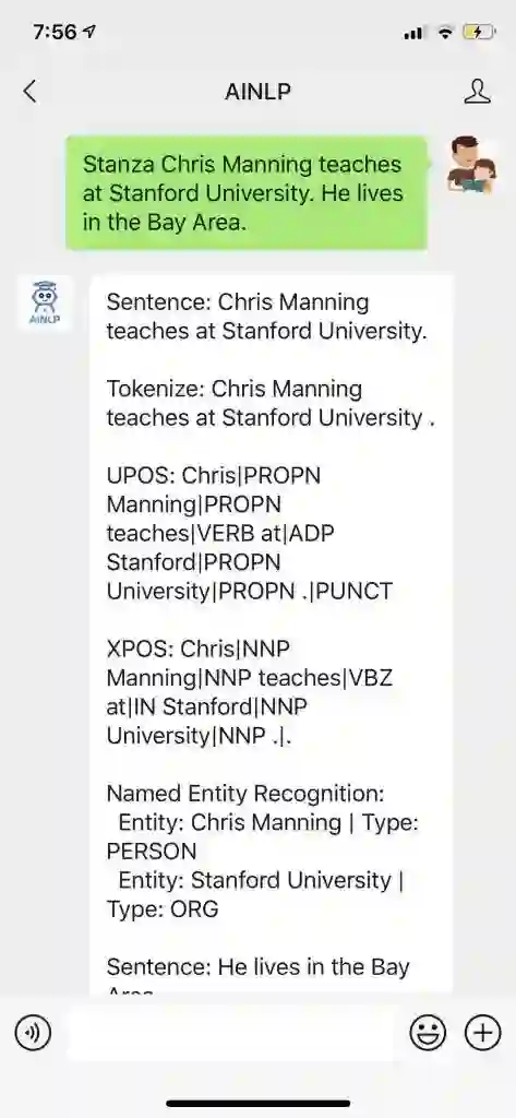也可以用来单独测试一个独立的NLP工具,例如斯坦福大学自然语言处理组的最新NLP工具Stanza: