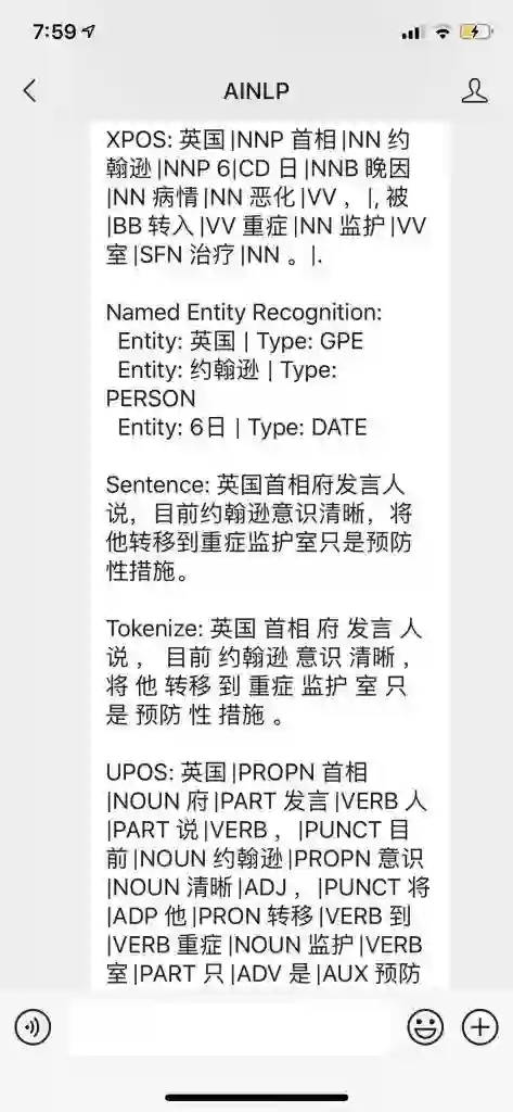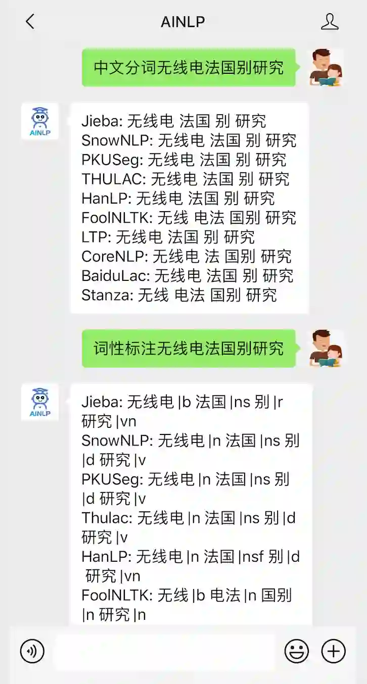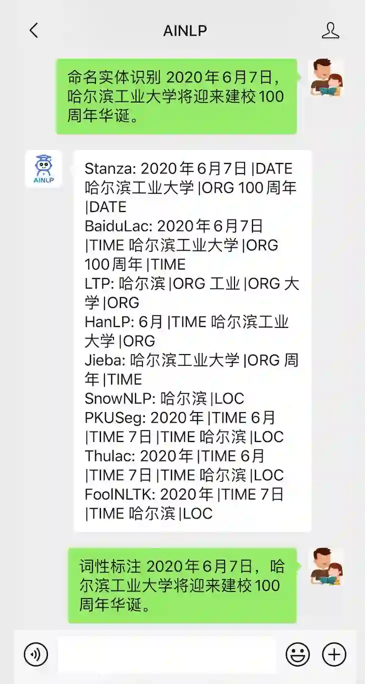 关注AINLP公众号后台回复可以根据关键词触发不同的功能,例如,可以直接用来对比分析NLP的相关工具,包括中文分词、词性标注、命名实体识别以及情感分析:
