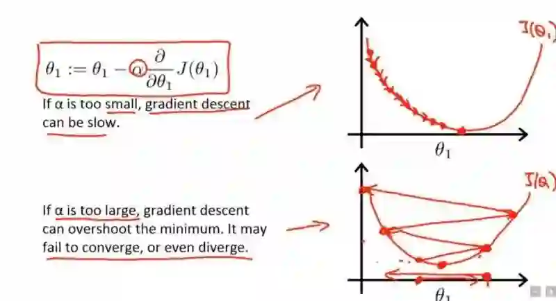 学习率很小(上图)与学习率很大(下图)的梯度下降。(来源:Coursera 机器学习课程,Andrew Ng)