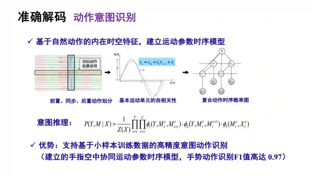 我们在研究中提出要用自然动作基本运动单元的自相关性,比如时间和空间特征,以及时间在有意动作和无意动作前后速度和角度的变化特征,复合动作的时序概率,可以用来进行意图推理。