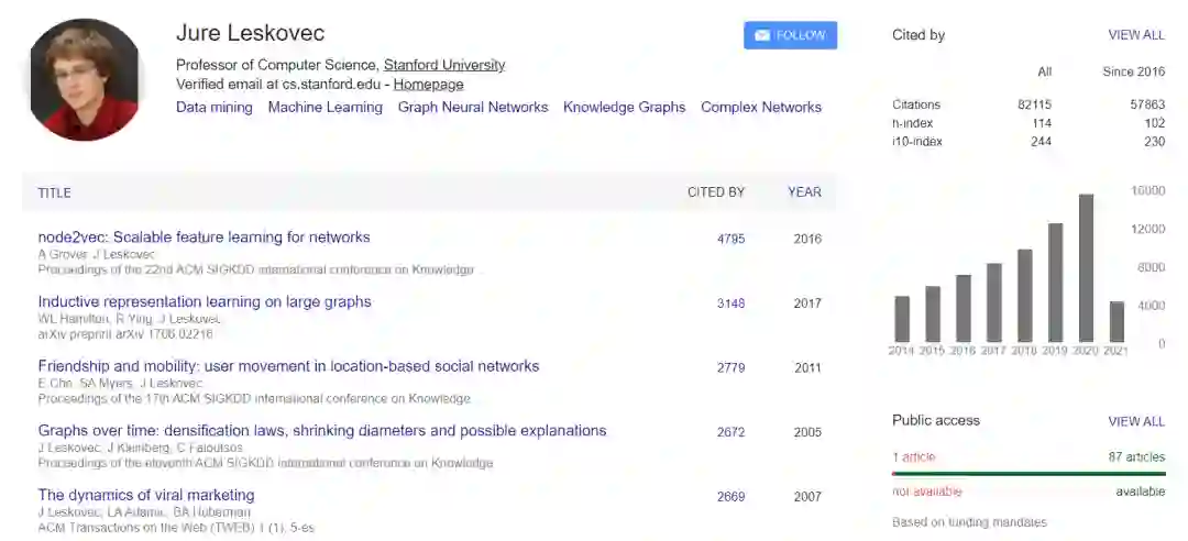 课程主讲人 Jure Leskovec 是斯坦福大学计算机科学副教授,也是图表示学习方法 node2vec 和 GraphSAGE 的作者之一。他主要的研究兴趣是社会信息网络的挖掘和建模等,特别是针对大规模数据、网络和媒体数据。据 Google Scholar 显示,Jure Leskovec 发表论文 400 余篇,被引用次数超过 82000 次,h 指数为 114。其论文多次发表在 Nature、NeurIPS、KDD、ICML 等期刊和学术会议上,并两次获得 KDD 时间检验奖。