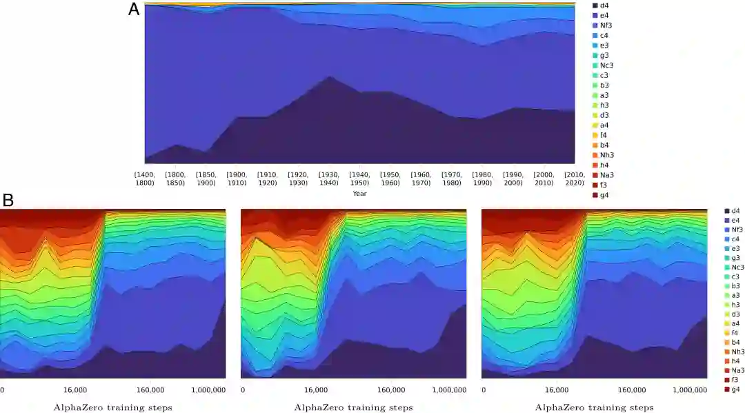 如图 3A 是人类对白棋的第一步偏好的历史演变,早期阶段,流行将 e4 作为第一步棋,后来的开局策略则变得更平衡、更灵活。