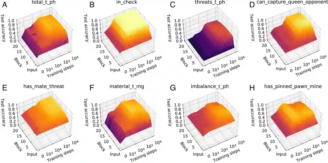 作者进一步分析了 AlphaZero 网络关于国际象棋的知识的演变过程:首先发现棋力;接着是短时间窗口内基础知识的爆炸式增长,主要是与 mobility 相关的一些概念;最后是改进阶段,神经网络的开局策略在数十万个训练步骤中得到完善。虽然整体学习的时间很长,但特定的基础能力会在相对较短的时间内迅速出现。