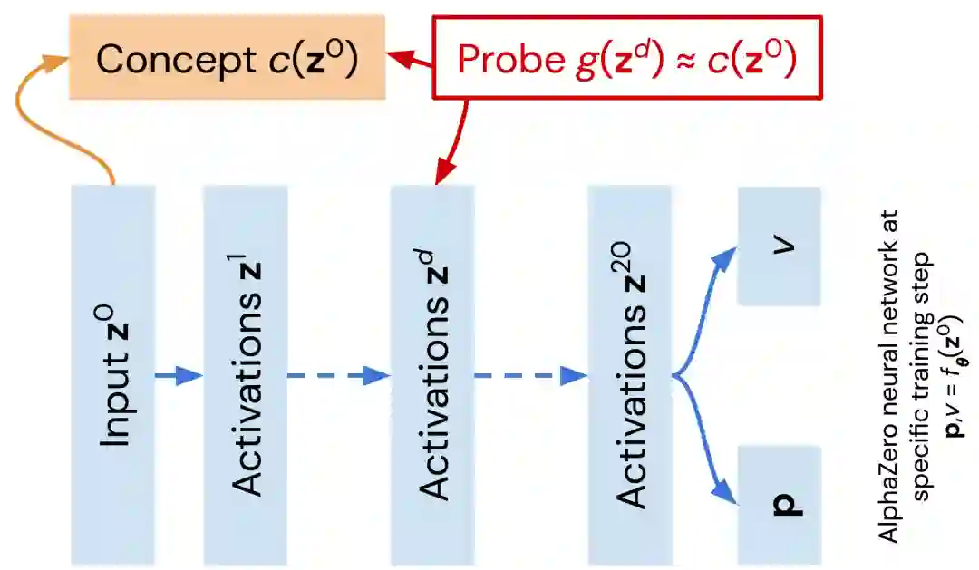 首先将概念定义为如图 1 中橙色所示的用户定义函数。广义线性函数 g 作为一个探针被训练用于近似一个国际象棋概念 c。近似值 g 的质量表示层(线性)对概念进行编码的程度。对于给定概念,对每个网络中所有层的训练过程中产生的网络序列重复该过程。