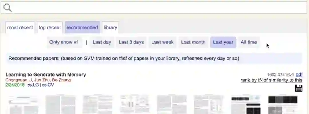 另外,library不光是用来收藏和跟进自己领域的论文更新进度,arxiv-sanity可以通过你收藏的内容给你推荐你也许会感兴趣的论文。具体怎么实现的呢?library内部的论文会被标记为positive,Library之外的论文标记为negative,然后arxiv-sanity基于bigram文本特征提取来训练你的personal SVM,然后在reconmmended 标签里推荐给你。点击recommended标签你就可以看到最近两周arxiv-sanity认为你会感兴趣的文献。当然,你也可以通过设置时间来自己筛选,如去年,上个月,上周,昨天和全部,看看自己有没有错过什么文献。