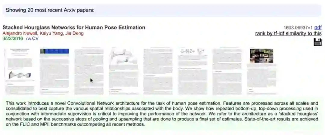 更重要的是,它可以让你根据自己的阅读兴趣对文献进行重新排序。比如这里有一篇关于对人体姿态估计的文献是你感兴趣的,点击右上角的' rank by tf-idf similarity to this',文献列表会按照与这篇文章的相关度进行排序,接下来我们会看到arxiv上所有关于人体姿态识别的论文。这个功能是基于TF-DF算法来实现的,效果很好。(一种文档特征提取法,它是由Salton在1988 年提出。其中TF称为词频, IDF称为反文档频率, 感兴趣的可以自己百度。)