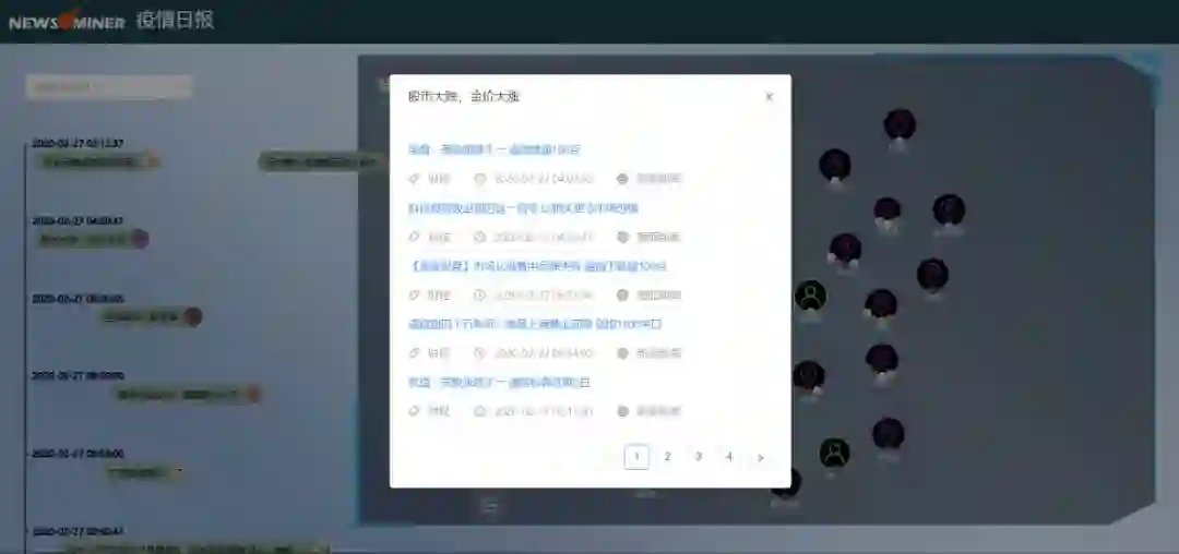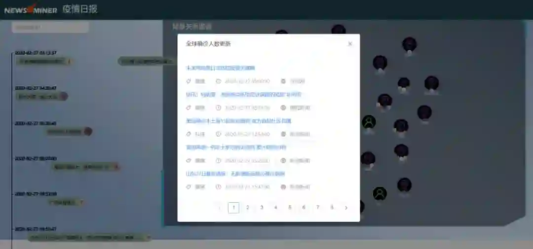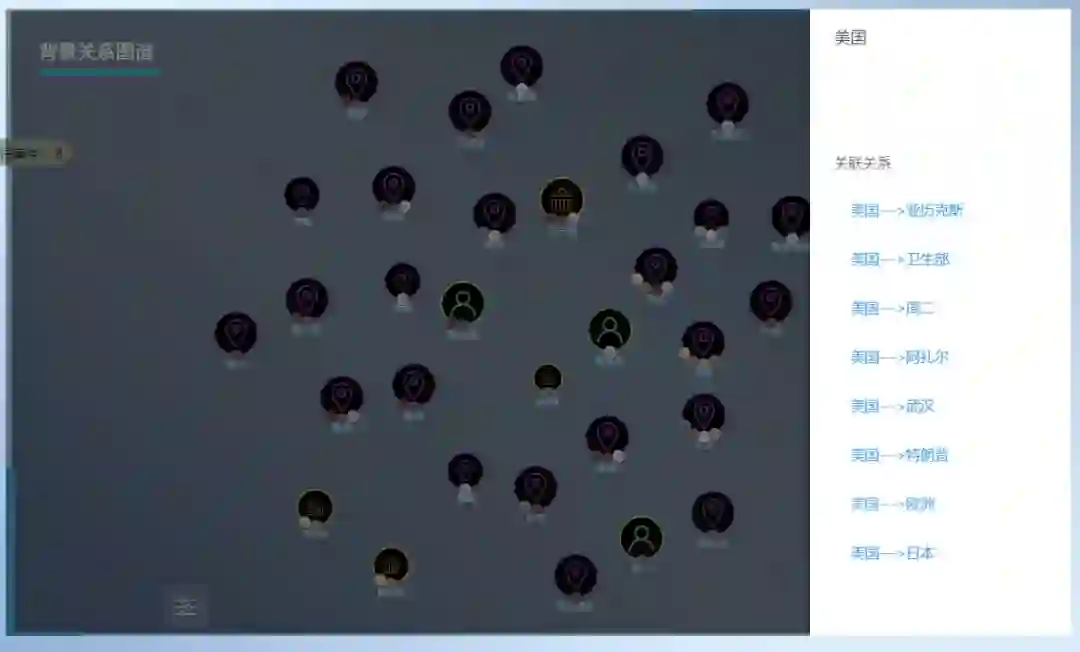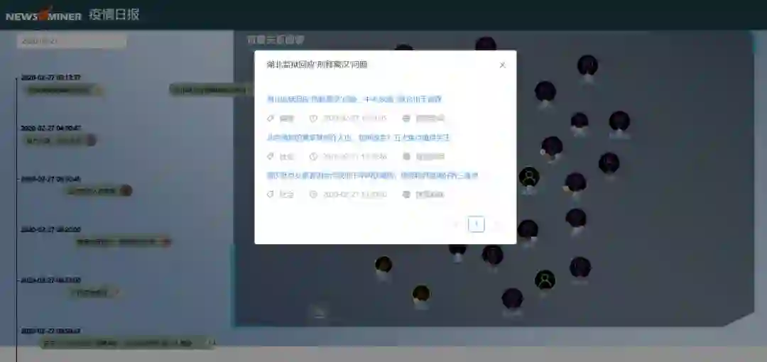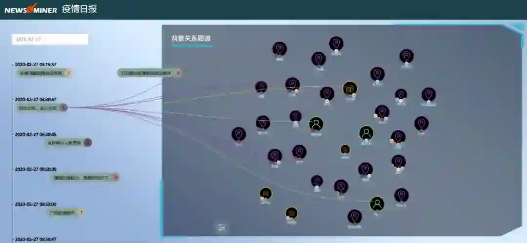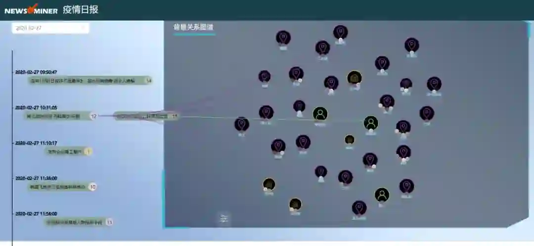 综合了环球网、人民网、网易健康、财新网肺炎疫情、医脉通、人民网疫情专栏、人民网特别关注、华商头条、正保医学教育网、新华健康、主要城市卫健委和疾控中心网站等主流媒体和网站的新冠疫情中文新闻报道,我们随机抽取3篇新闻分别从新冠疫情新闻事件流、热门人物、地区和组织机构关系、背景关系图谱几个方面分析其中的人物和新闻之间的关系。
