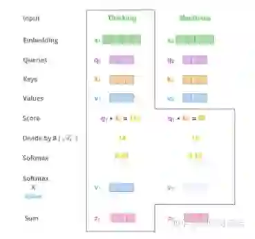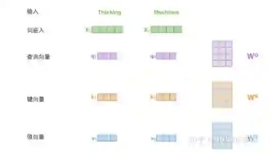 在self-attention中,每个单词有3个不同的向量,它们分别是Query向量,Key向量和Value向量,长度均是64。它们是通过3个不同的权值矩阵由嵌入向量X乘以三个不同的权值矩阵得到,其中三个矩阵的尺寸也是相同的。均是512×64。