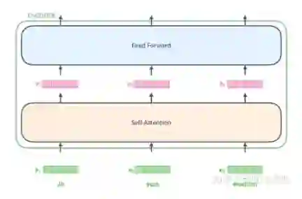 输入的每个单词通过嵌入的方式形成词向量,通过自注意进行编码,然后再送入FFN得出一个层级的编码。